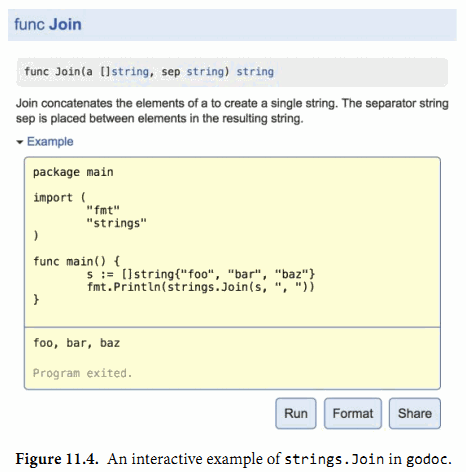 示例函数的第三个目的提供一个真实的演练场。 http://golang.org 就是由godoc提供的文档服务,它使用了Go Playground让用户可以在浏览器中在线编辑和运行每个示例函数,就像图11.4所示的那样。这通常是学习函数使用或Go语言特性最快捷的方式。