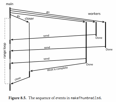 图8.5 表明了makethumbnails6函数中事件的序列。纵列表示goroutine。窄线段代表sleep,粗线段代表活动。斜线箭头代表用来同步两个goroutine的事件。时间向下流动。注意main goroutine是如何大部分的时间被唤醒执行其range循环,等待worker发送值或者closer来关闭channel的。